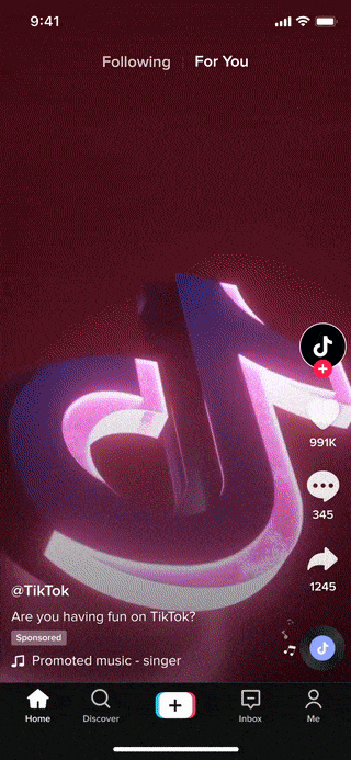 这些全屏广告会在用户打开应用后立即出现在 FYP 上。 它们可以使用 3 到 5 秒的视频或 3 秒的图像创建,并可用于将用户引导至 Hashtag Challenge 或登录页面(取决于品牌的活动目标)。 用户每天只能看到一个 Branded Takeover 广告,这意味着竞争较少,但也使它们有点贵。